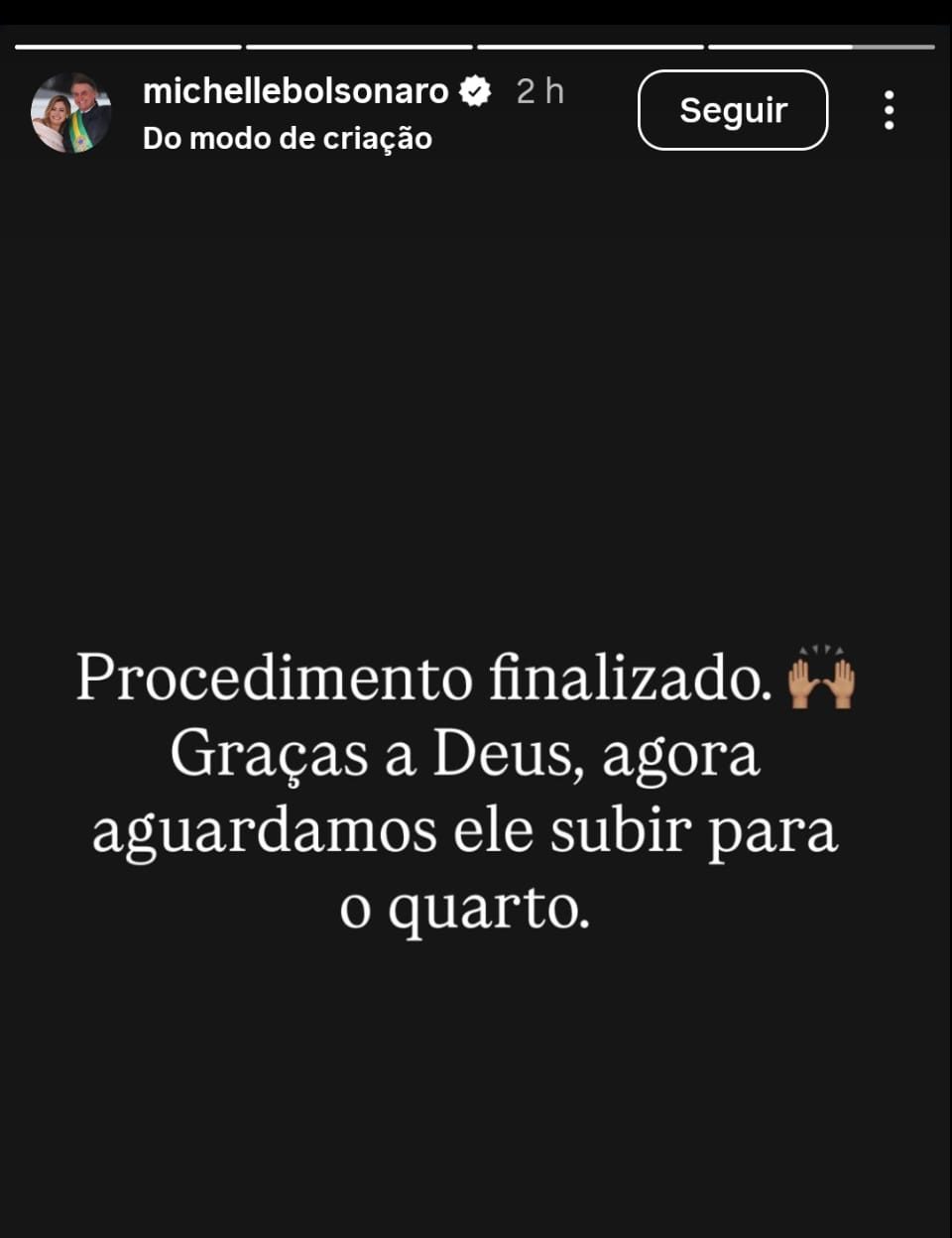 “Procedimento finalizado. Graças a Deus, agora aguardamos ele subir para o quarto”, escreveu Michelle nas redes sociais. Bolsonaro está internado no Hospital DF Star desde a véspera de Natal, onde segue em acompanhamento médico após cirurgia realizada no dia 25 de dezembro.