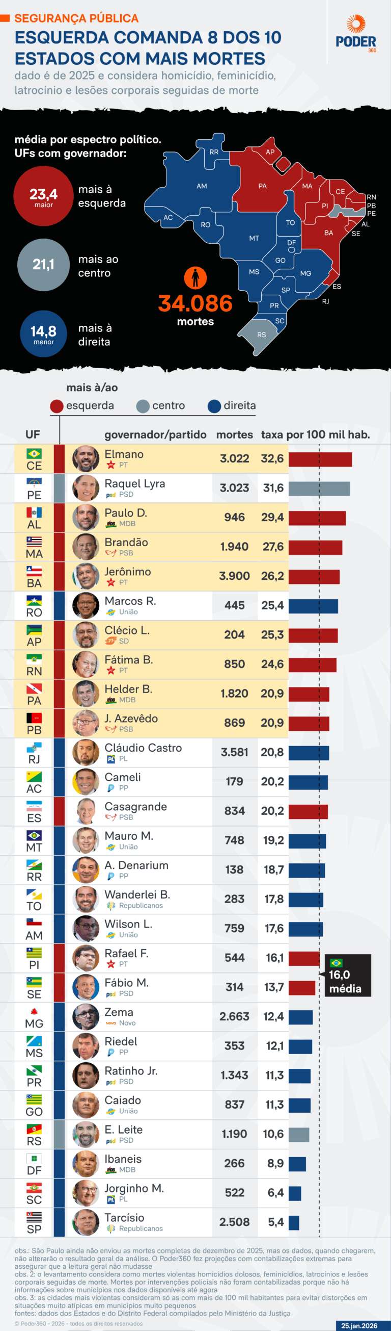 O Ceará, sob gestão de Elmano de Freitas (PT), ocupa o primeiro lugar no ranking nacional com 32,6 mortes por 100 mil habitantes. Pernambuco, governado por Raquel Lyra (PSD), considerada de centro, aparece em segundo lugar com 31,6 mortes.