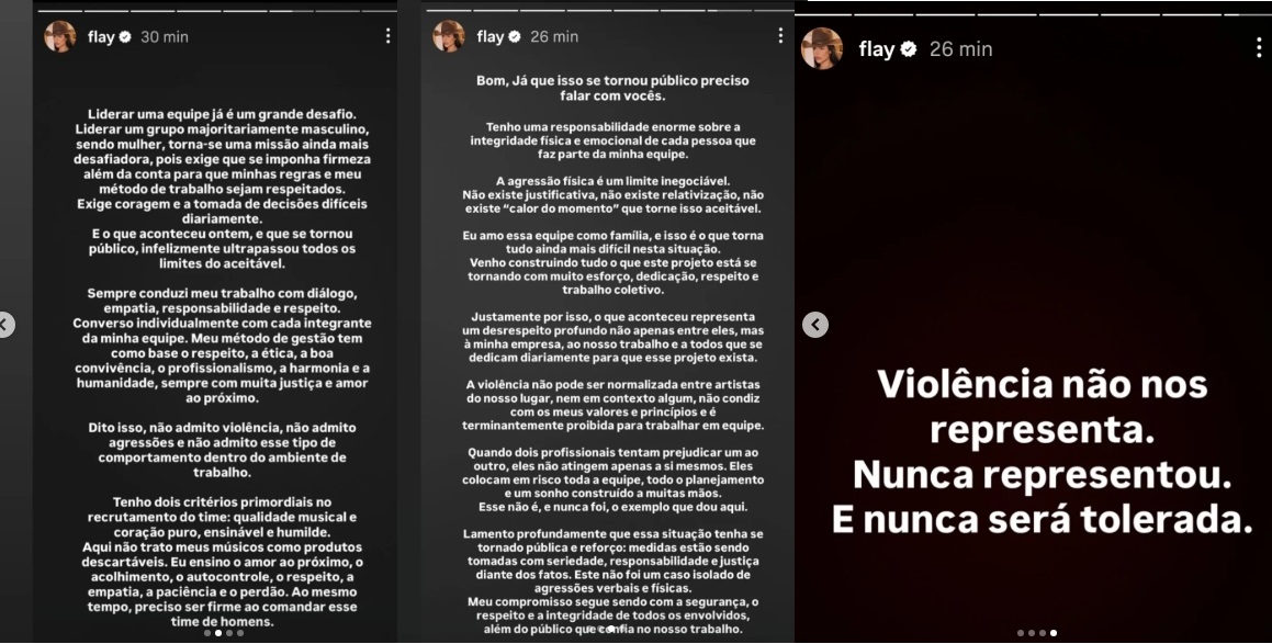 Nesta quinta-feira (29), Flay publicou um comunicado afirmando que a briga “ultrapassou todos os limites do aceitável”. Segundo a cantora, ela não admite violência nem agressões no ambiente de trabalho e destacou que sempre conduziu sua equipe com diálogo, respeito e responsabilidade.