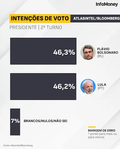 A variação indica crescimento de 1,4 ponto percentual de Flávio no segundo turno e queda de 3 pontos de Lula entre as duas medições. No acumulado, a diferença de 4,3 pontos pró-Lula registrada no início do ano é revertida para um cenário de equilíbrio.