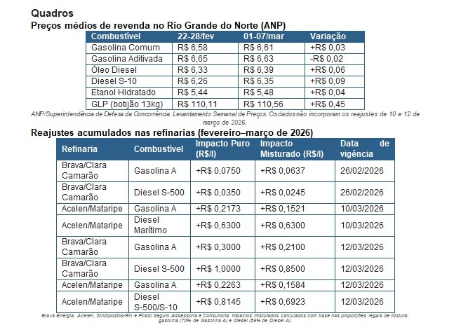 Em 10 de março, a Acelen elevou a Gasolina A em R$ 0,2173 por litro na Refinaria de Mataripe. Dois dias depois, em 12 de março, a Brava Energia aplicou o segundo reajuste do mês na Refinaria Clara Camarão — desta vez, de R$ 0,3000 na Gasolina A e de expressivos R$ 1,00 por litro no Diesel S-500. Na mesma data, a Acelen também anunciou novo aumento: R$ 0,2263 por litro na gasolina e R$ 0,8145 no diesel.