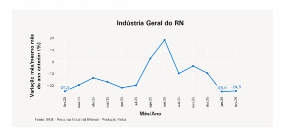 A produção industrial do Rio Grande do Norte recuou 24,5% em fevereiro, na comparação com o mesmo mês do ano passado, segundo dados da Pesquisa Industrial Mensal (PIM) Regional, realizada pelo Instituto Brasileiro de Geografia e Estatística (IBGE) e divulgada nesta quarta-feira (9). Todas as atividades industriais pesquisadas no estado registraram perdas no período.