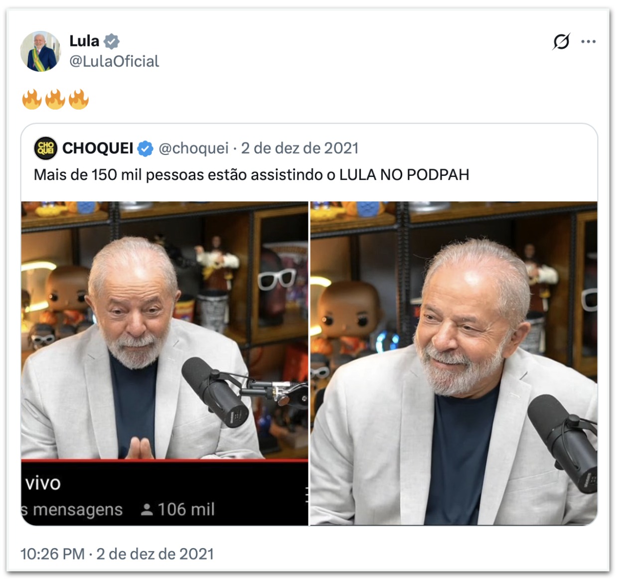 A 1ª interação entre Lula e o perfil no X foi em 2 de dezembro de 2021. Na ocasião, a conta publicou um print de uma entrevista do então ex-presidente no podcast PodPah, mencionando que era vista por 150 mil pessoas. Lula repostou com 3 emojis de fogo.