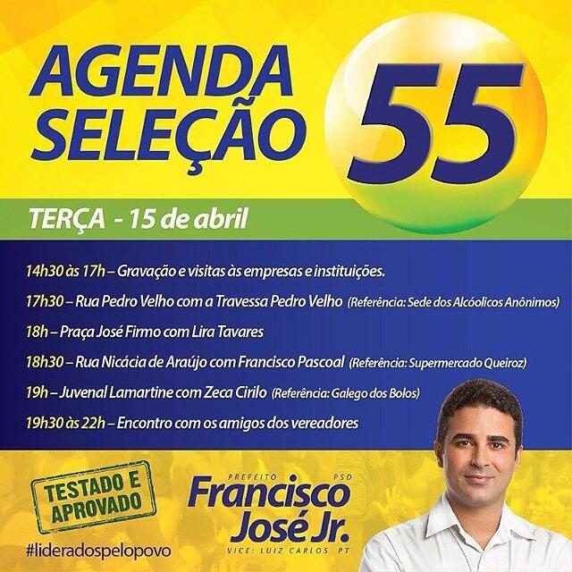 Acaba de ser disponibiliza a agenda dos candidatos a prefeito, Francisco José Júnior, PSD, e vice, Luís Carlos, PT, para esta terça-feira, 15.