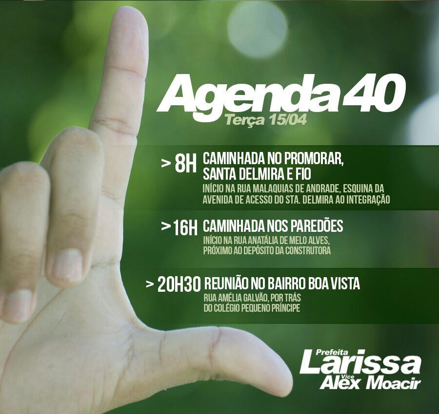 Confira a agenda dos candidatos a prefeito e vice, respectivamente, Larissa Rosado, PSB e Alex Moacir, PMDB, para esta terça-feira, 15.
