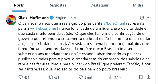 Em publicação nas redes sociais, Gleisi disse que o “verdadeiro risco” apontado pela revista não seria a idade de Lula, mas a continuidade do atual governo. Segundo ela, o temor estaria relacionado a políticas que, na avaliação do PT, enfrentam desigualdades tributárias e sociais e ampliam a atuação do Estado na economia.
